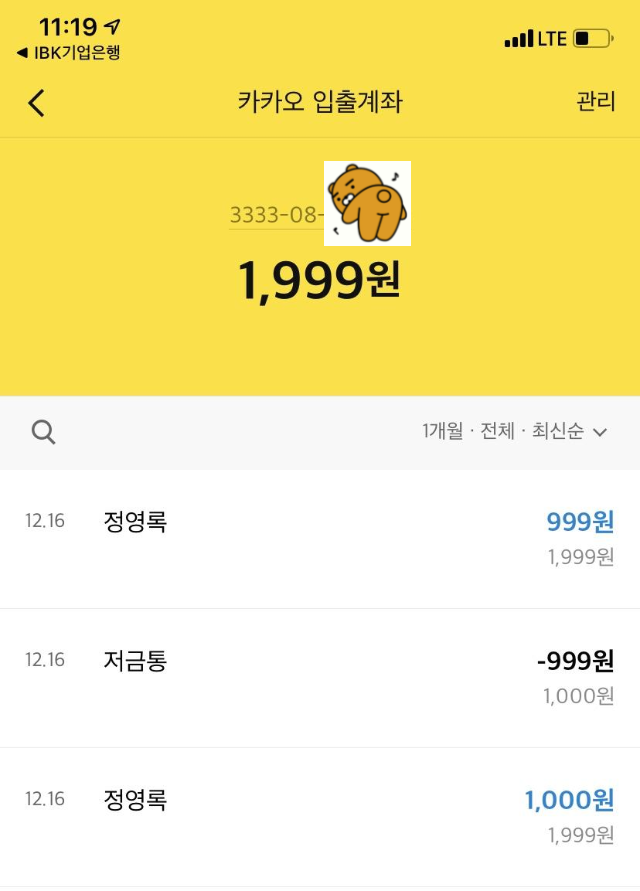 1천원 이상 잔액이 있는 경우에 한해 잔돈을 모아준다 해서 1999원 넣어놓음.