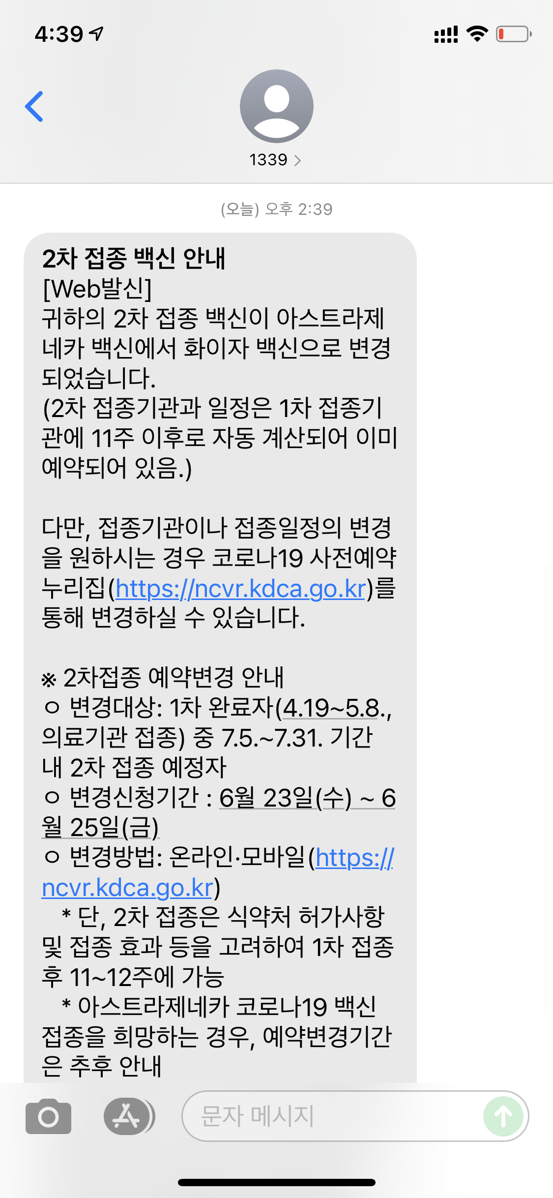 귀하의 2차 접종 백신이 아스트라제네카 백신에서 화이자 백신으로 변경되었습니다.