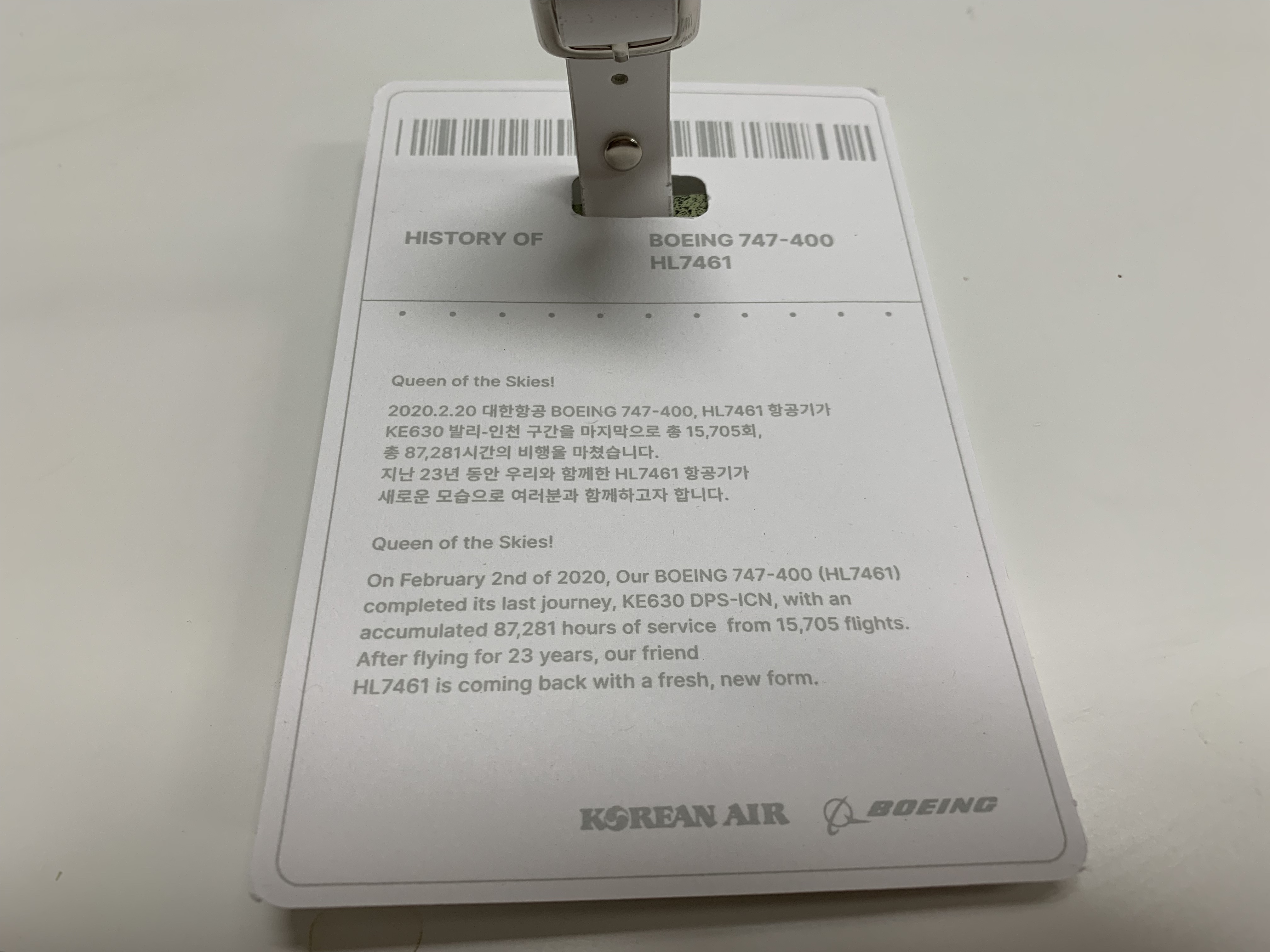 HL7461은 대한항공이 글로벌 항공사로 성장하는 데 핵심 역할을 했던 보잉 747-400 여객기 중 마지막 보유 항공기다. HL7461은 지난 1997년 도입되어 23년 동안 전 세계의 하늘을 누비다가 지난 2020년 2월 발리~인천 비행을 끝으로 은퇴했다.