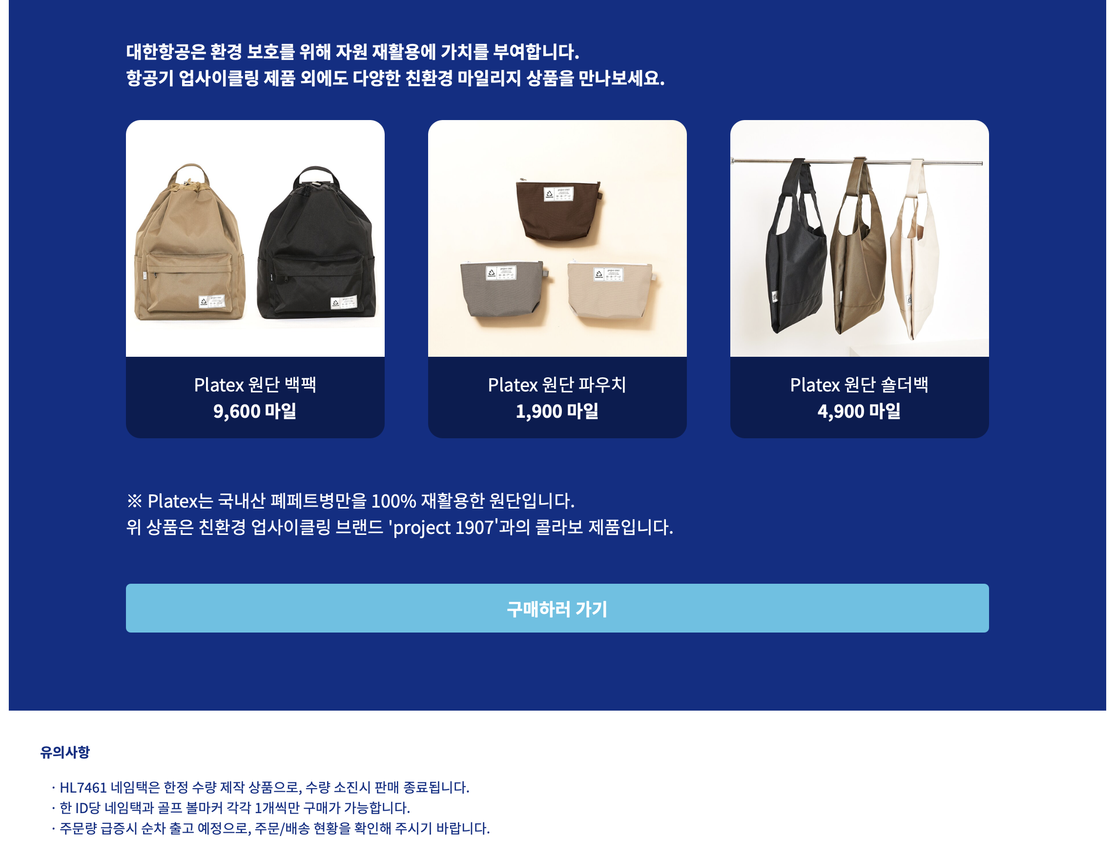 한편 대한항공은 이와는 별도로 친환경 업사이클링 브랜드 ‘project 1907’과의 콜라보로 폐 페트병을 재활용한 플라텍스(Platex) 원단으로 만든 백팩, 에코 숄더백, 파우치 등의 상품을 마일리지 몰에 출시했다.
