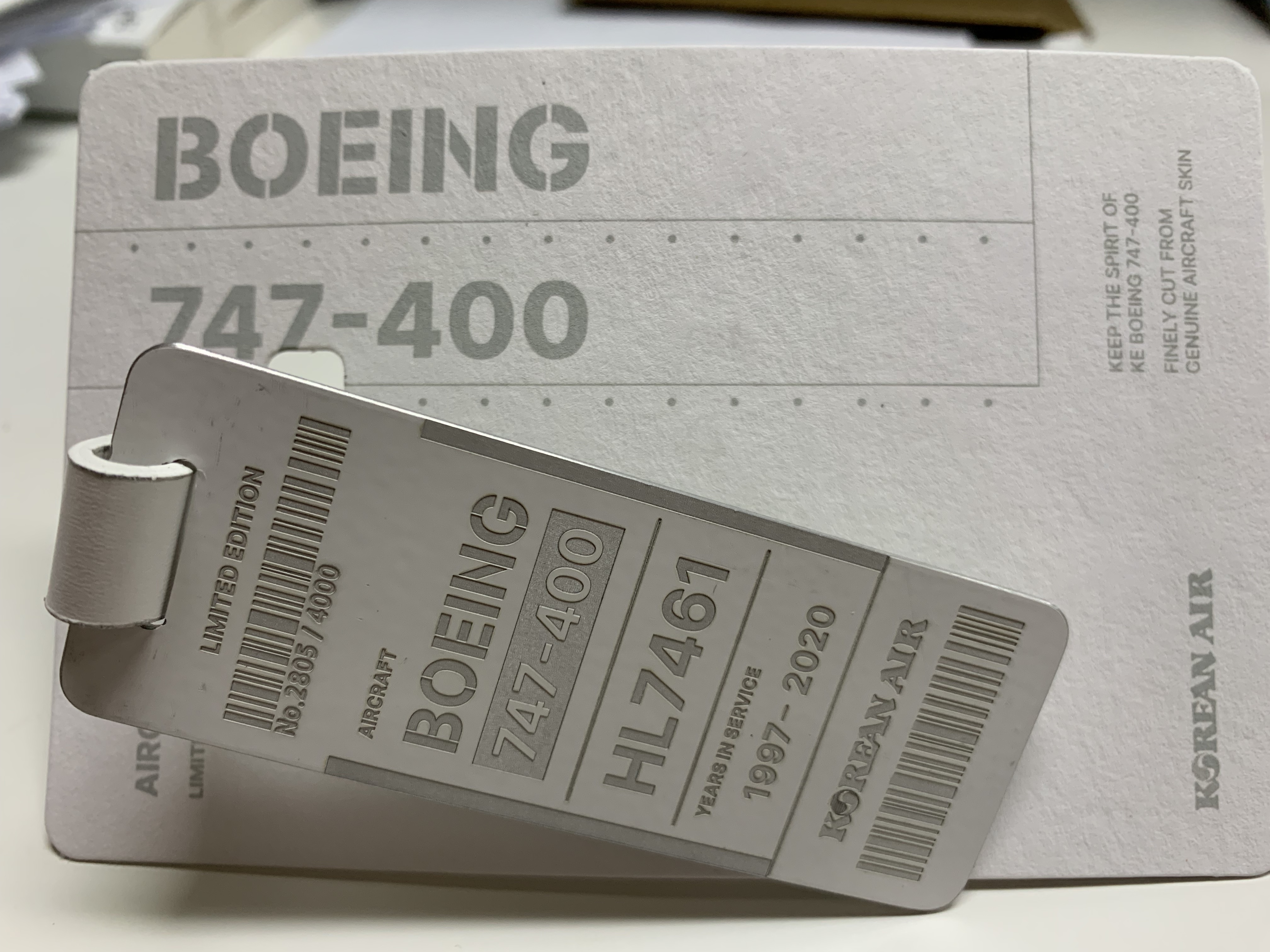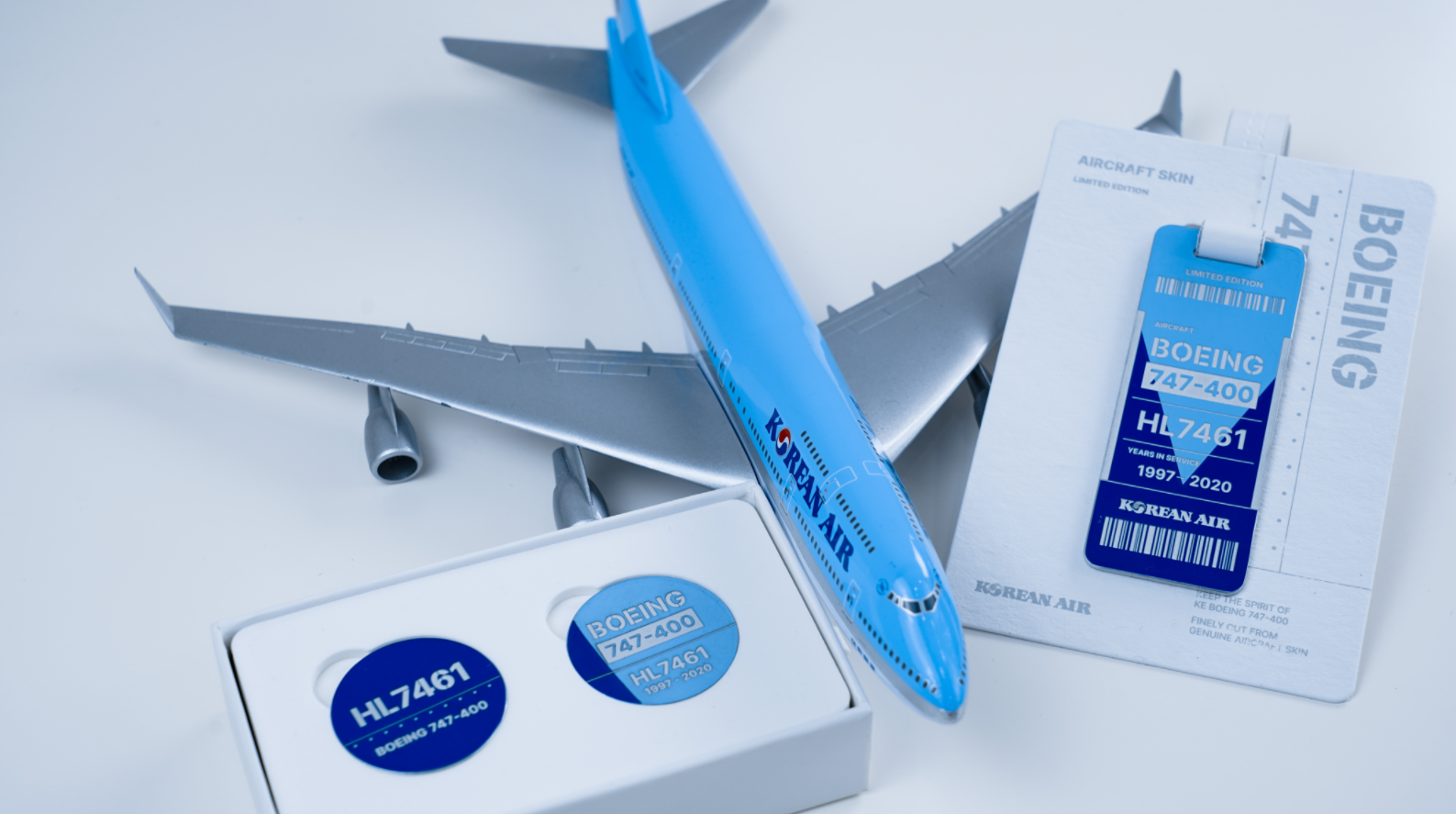 대한항공 보잉 747-400 마지막 여객기의 추억을 담은 네임택과 볼마커는 항공기 동체 표면을 잘라내어 제작됐으며, 사용된 동체 부분에 따라 색상과 디자인이 각기 다르다. 두 제품에는 ‘B747-400’ 레터링과 함께 항공기 일련번호인 HL7461가 새겨져 있으며, 고유번호가 각인되어 있어 희소 가치를 더한다.
