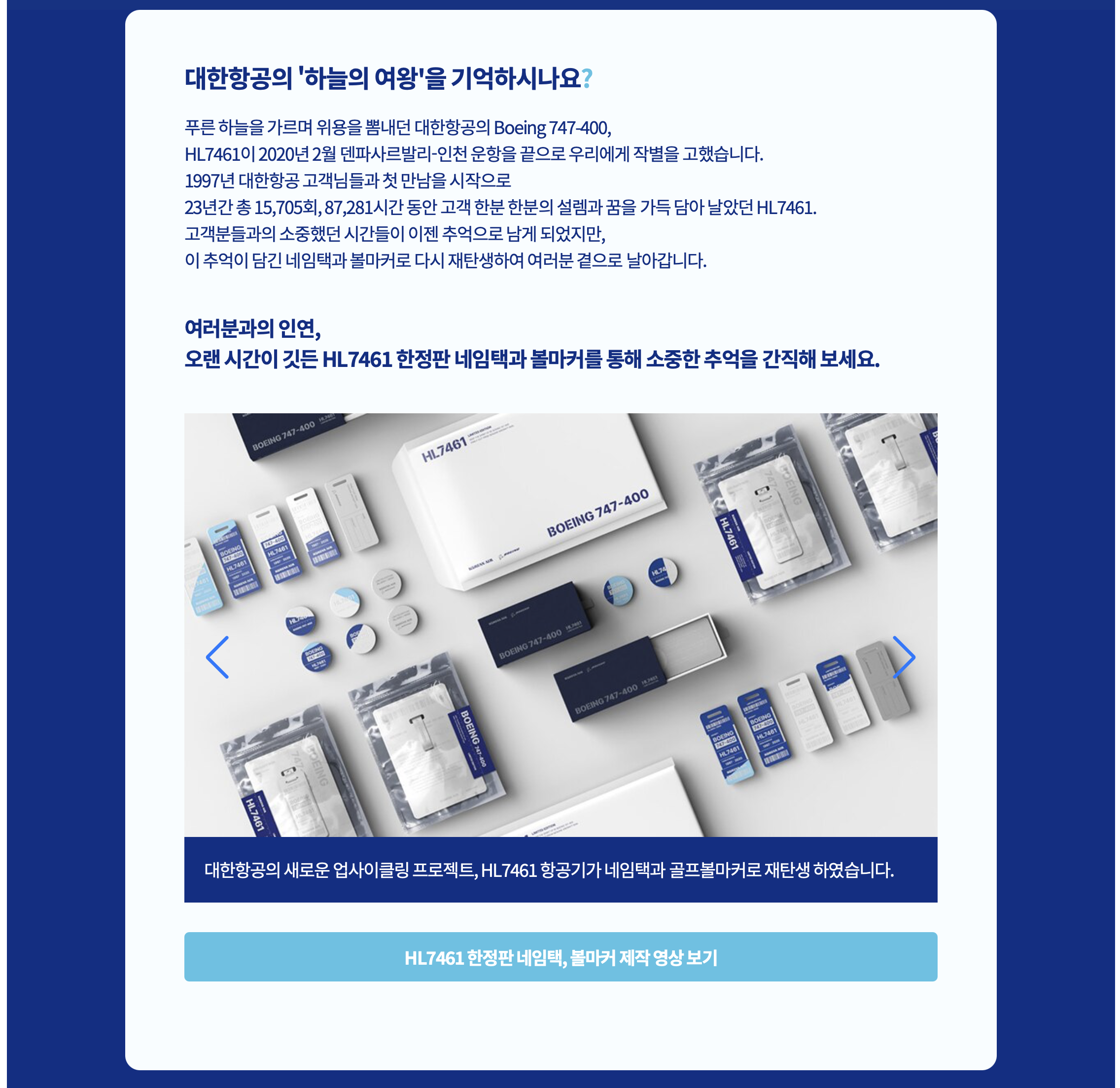대한항공이 은퇴한 항공기를 활용해 친환경 마일리지 상품을 제작·출시한 것은 이번이 두 번째로 지난 1월 보잉 777 항공기의 폐 자재로 네임택을 출시해 큰 인기를 끈 바 있다.