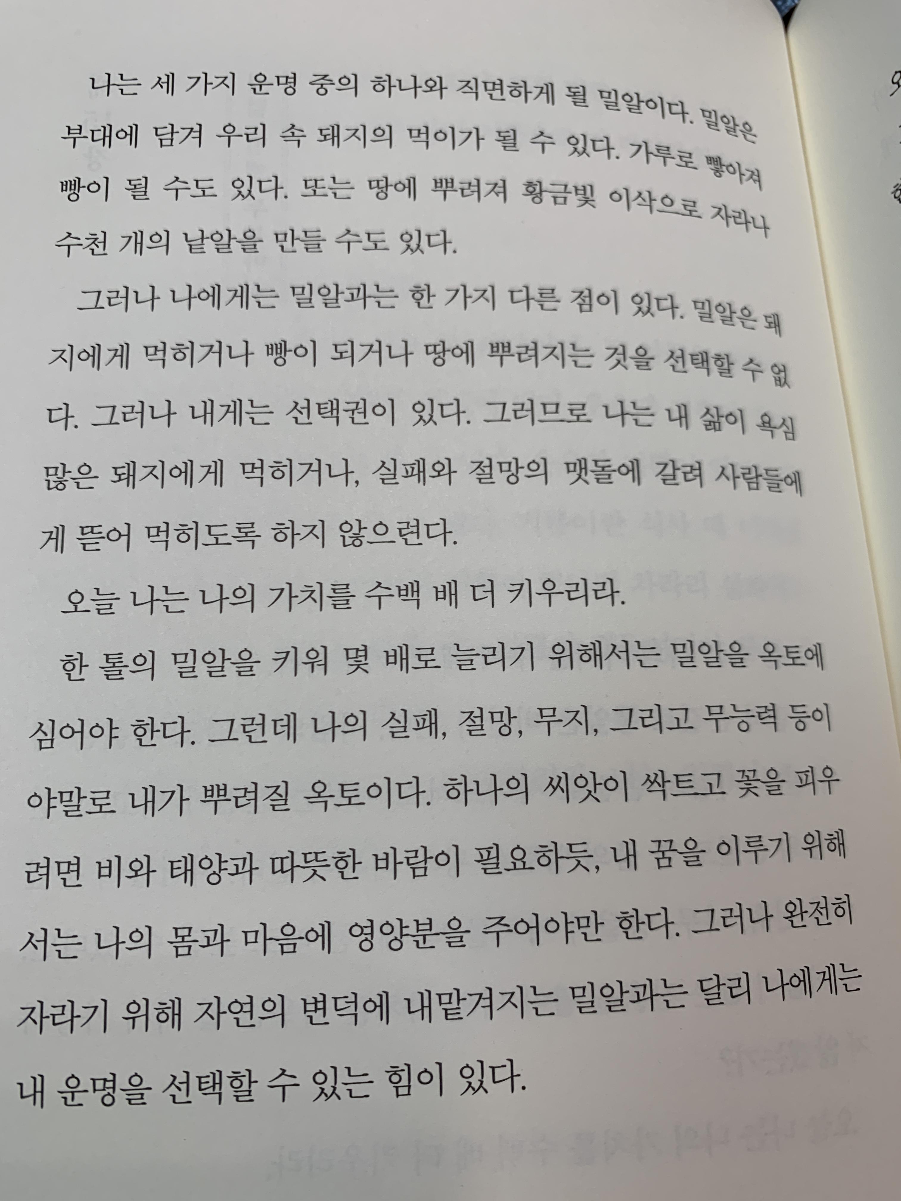 삶의 보상은 인생행로의 시작에 있는 것이 아니라 끝에 있다. 내 목표에 도달하기 위해 얼마나 많이 걸어야 할는지 알 수 없다. 수천 걸음을 내디딘 후에도 실패와 마주칠 수 있다. 그러나 성공은 바로 그 다음 길모퉁이에 숨어 있다. 내가 그 모퉁이를 돌지 않는 한, 성공에 얼마나 가까이 왔는지 절대로 알 수 없으리라.