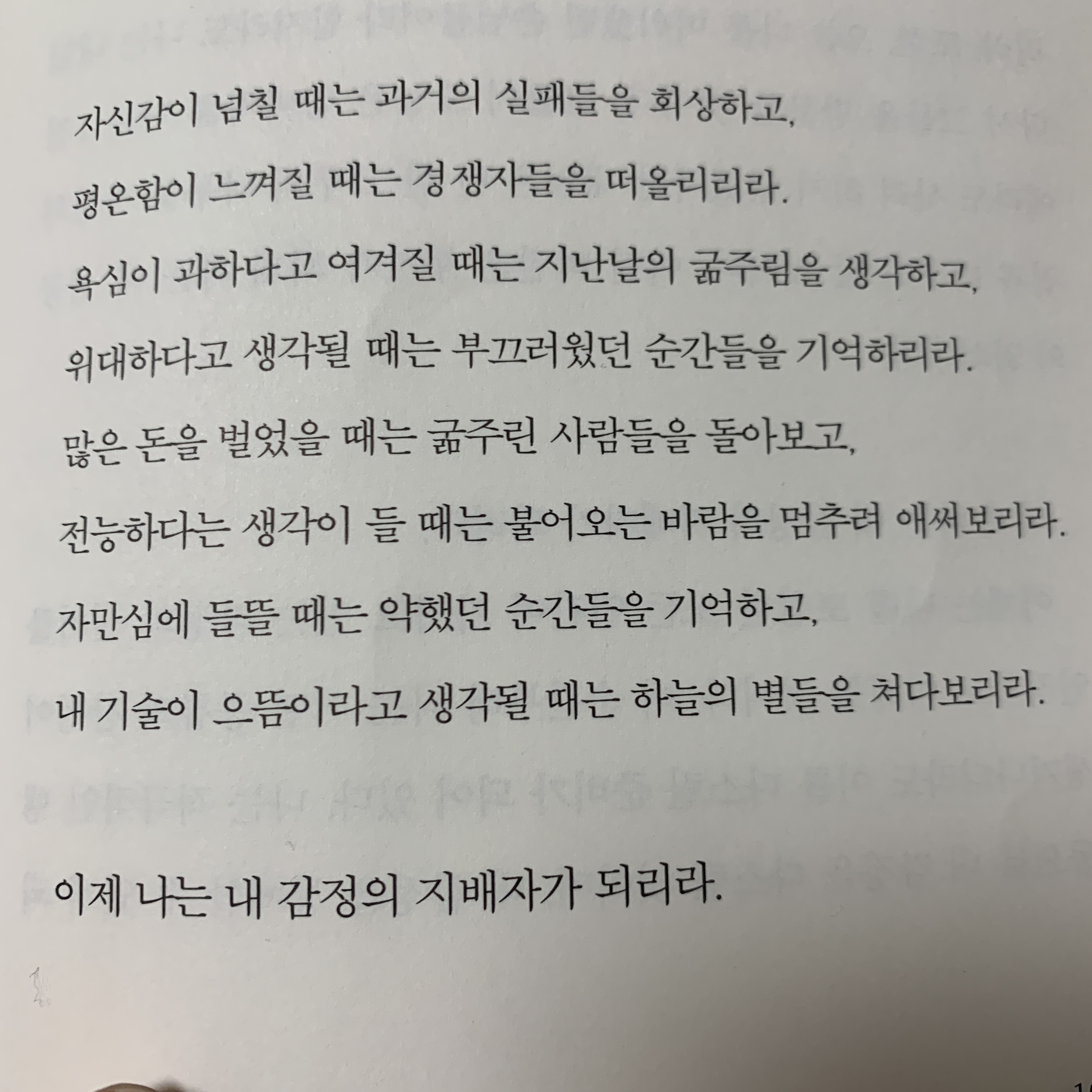내가 비록 자연의 가장 위대한 창조물일지언정 결국은 시간의 바람에 흩날리는 낟알에 불과하지 않겠는가? 내가 정년 어디에서 왔으며, 어디로 가는지 알고 있는가? 오늘의 걱정거리를 십 년 후에 되돌아본다면 우습지 않겠는가? 왜 오늘의 사소한 일이 내 마음을 어지럽히게 내버려두는가?