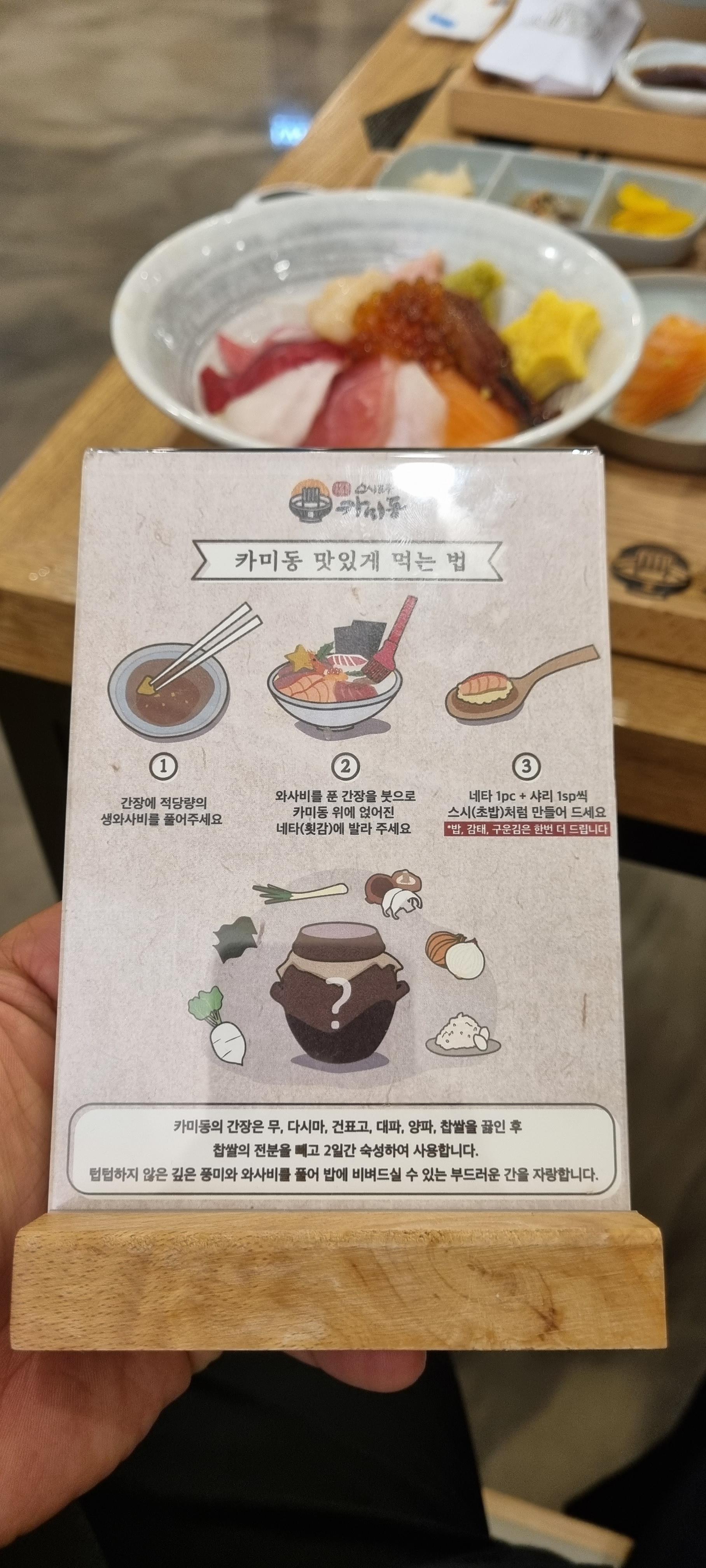 대기가 길기도 하고, 메뉴 구성이 바뀌기도 해 안내해주시는 분이 건녀편 스시도쿠 카미동을 추천해주심.