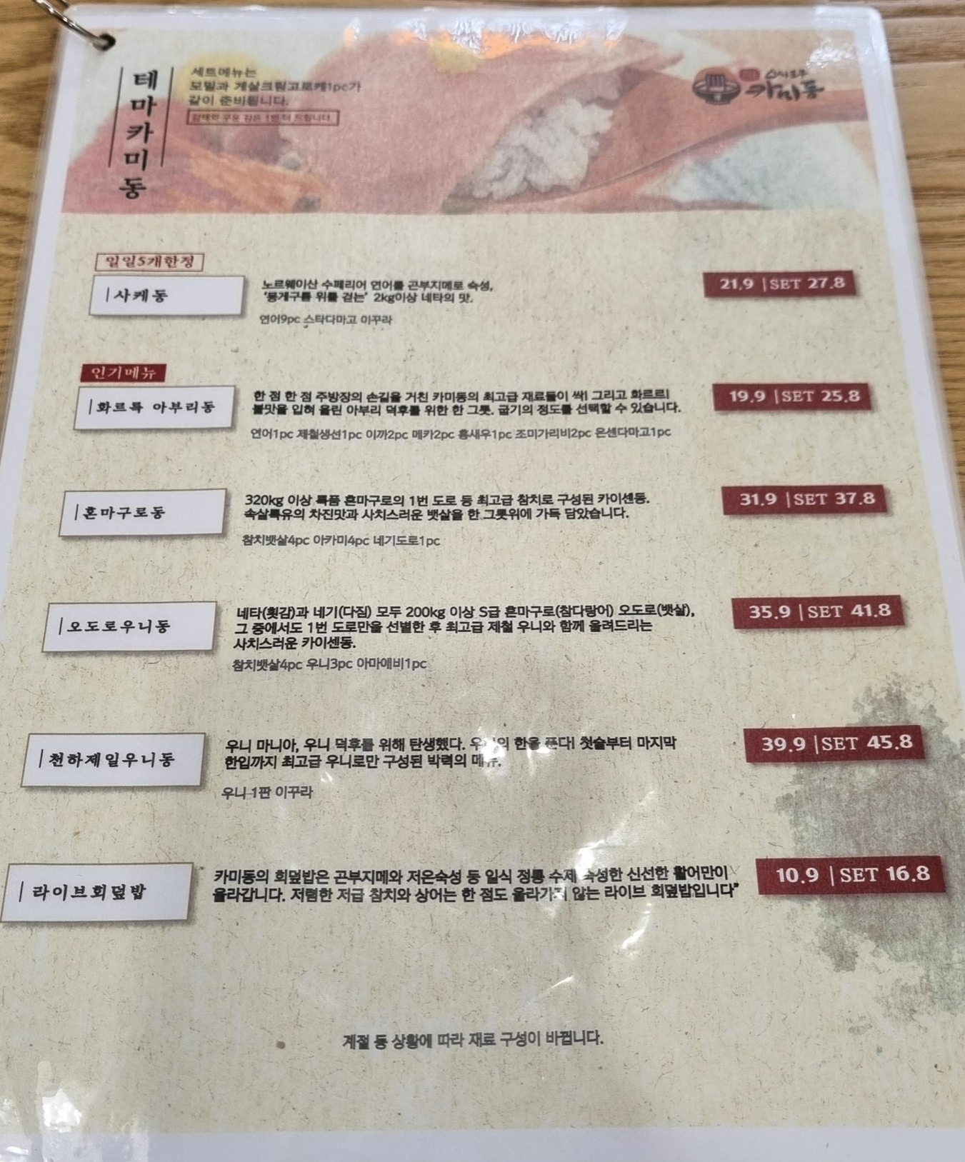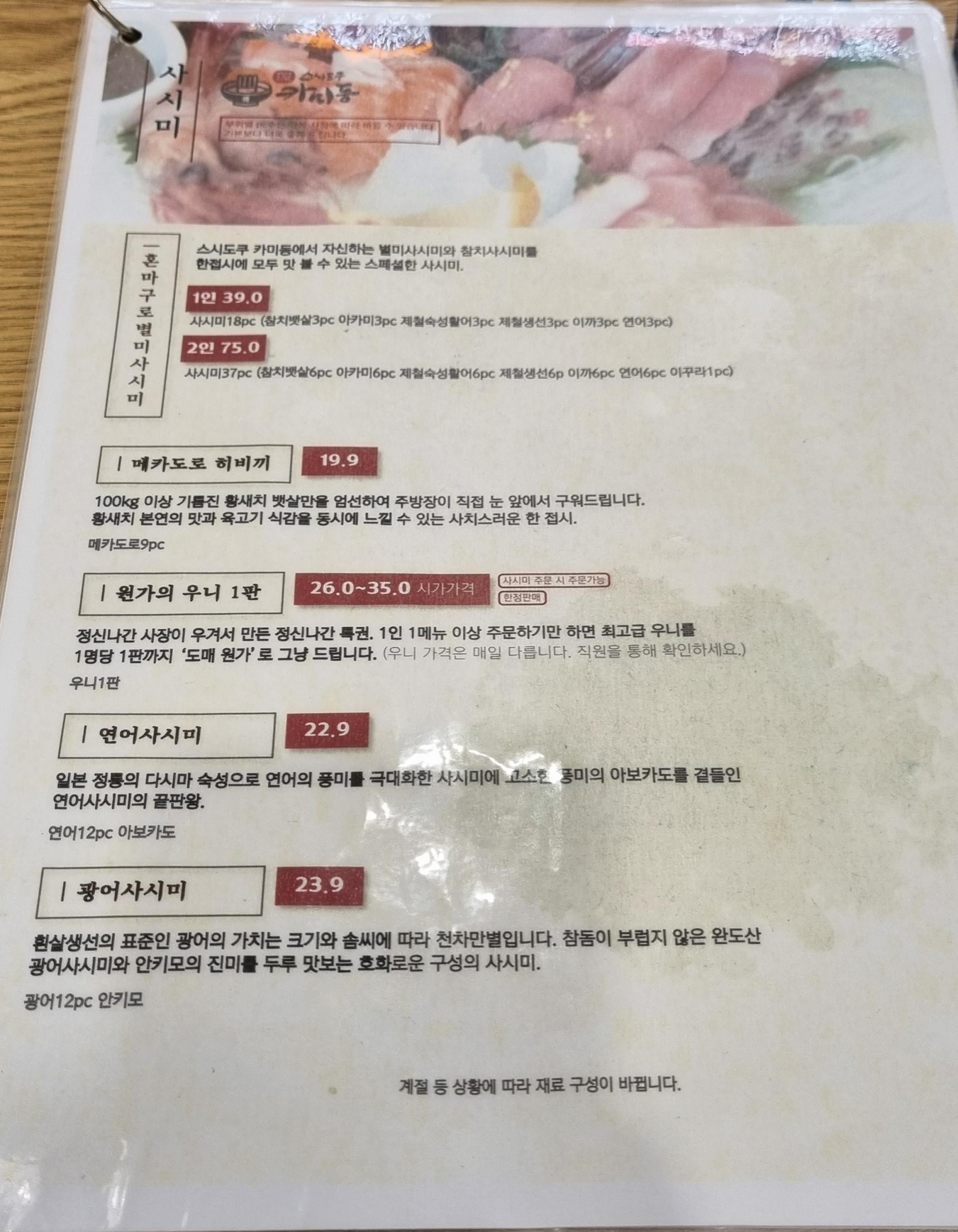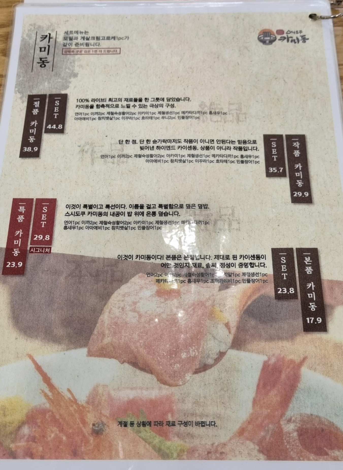 대기가 길기도 하고, 메뉴 구성이 바뀌기도 해 안내해주시는 분이 건녀편 스시도쿠 카미동을 추천해주심.