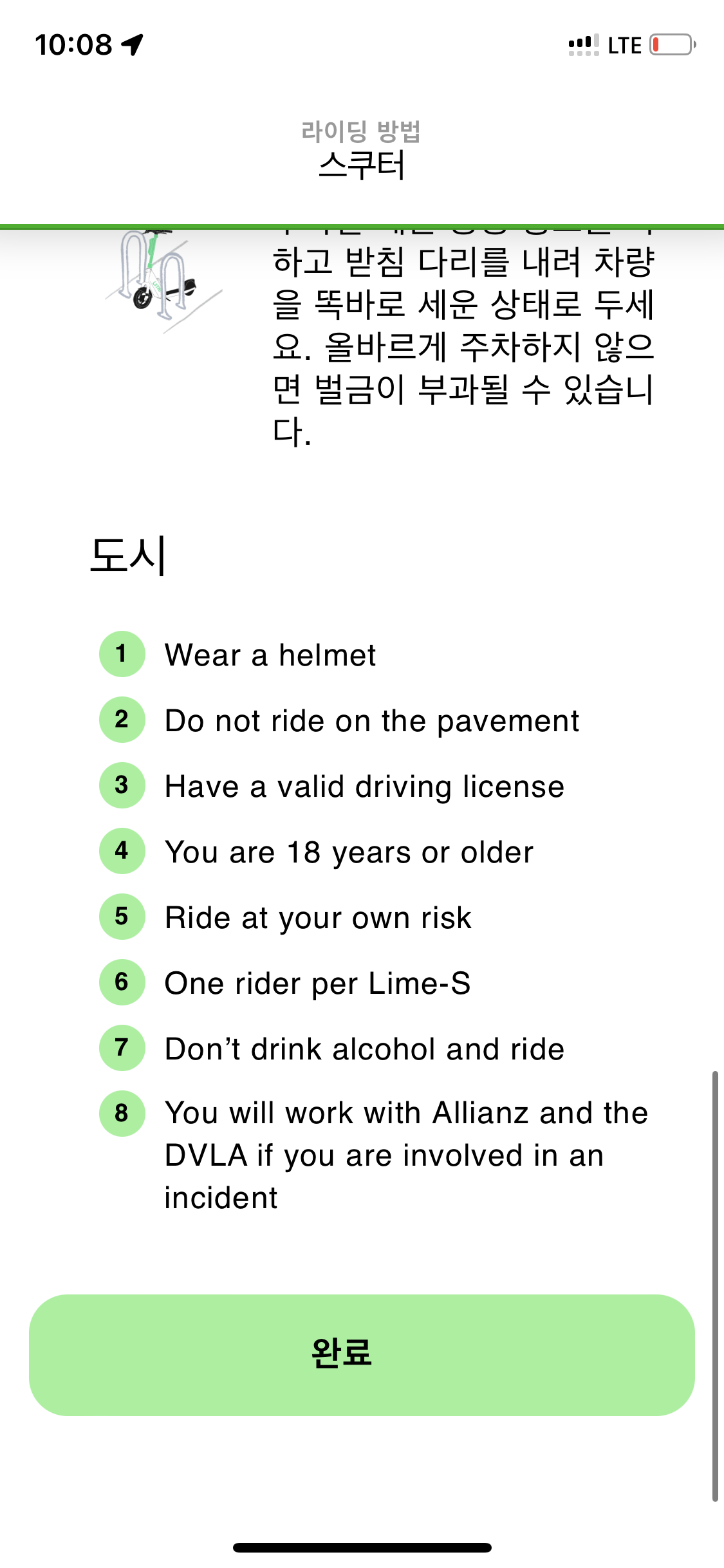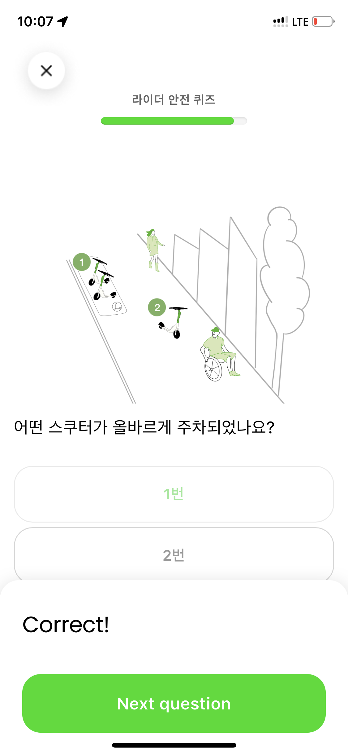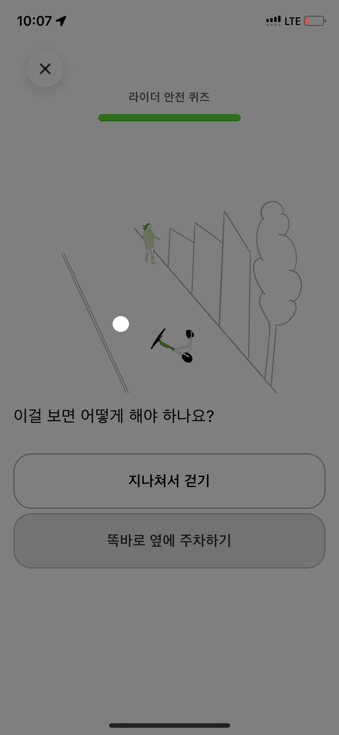 앞에도 캡쳐못한 여러 퀴즈가 있었는데 하여간 퀴즈도 다 풀고 안전교육도 이수한 뒤 딱 한 대 있는 라임 킥보드를 발견해 시동 걸었음.
