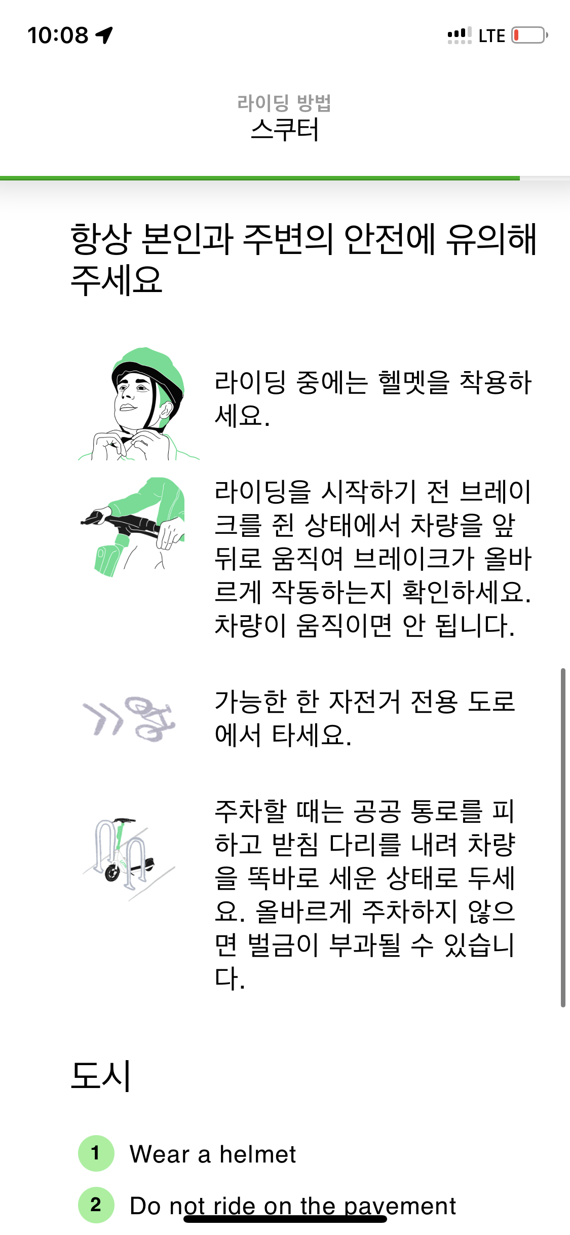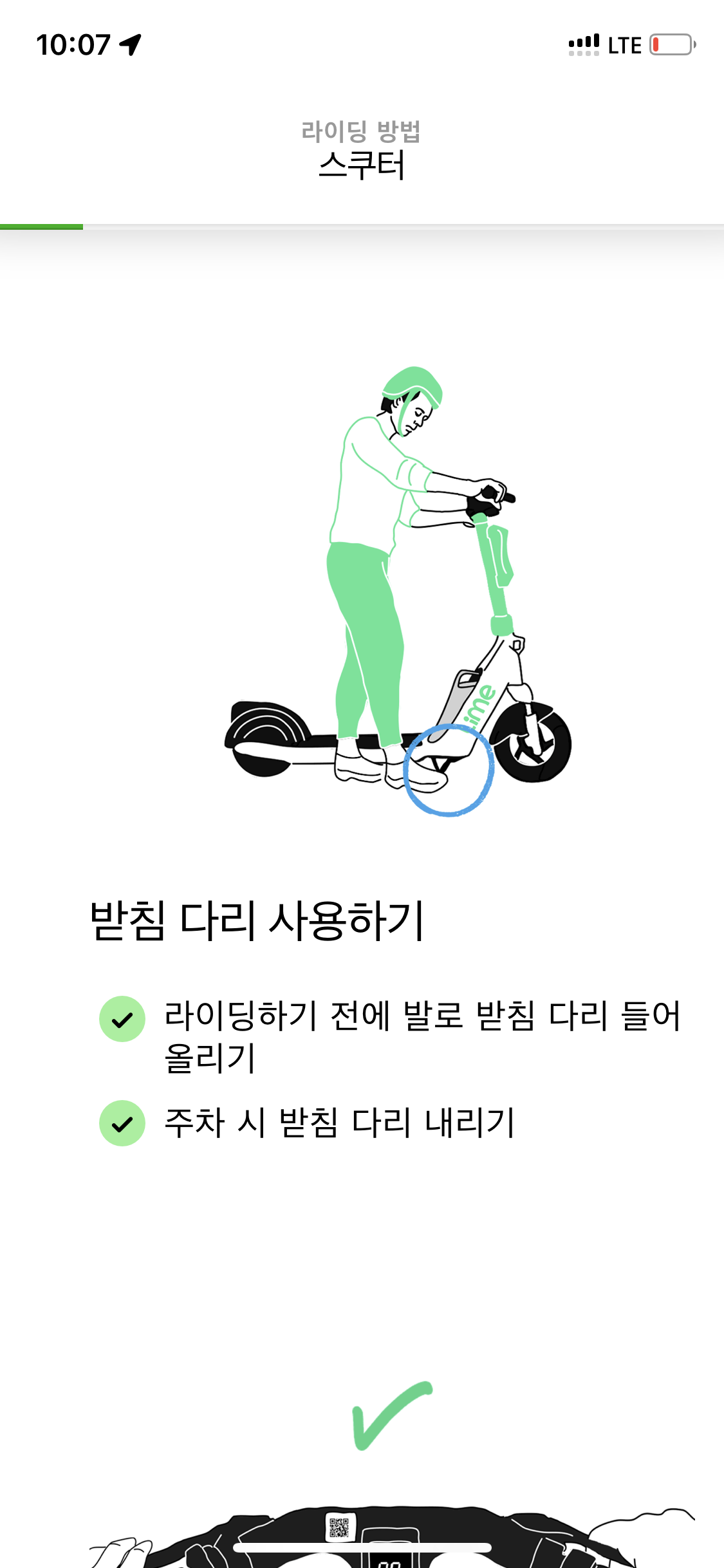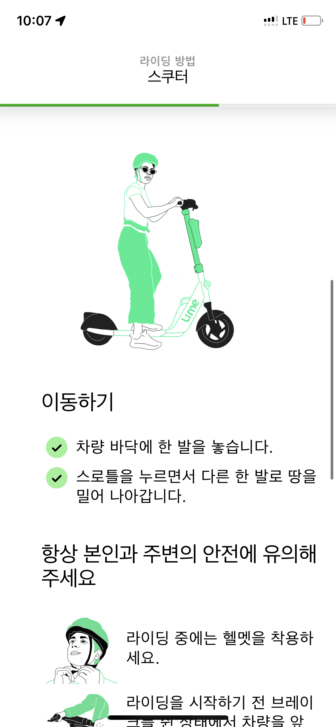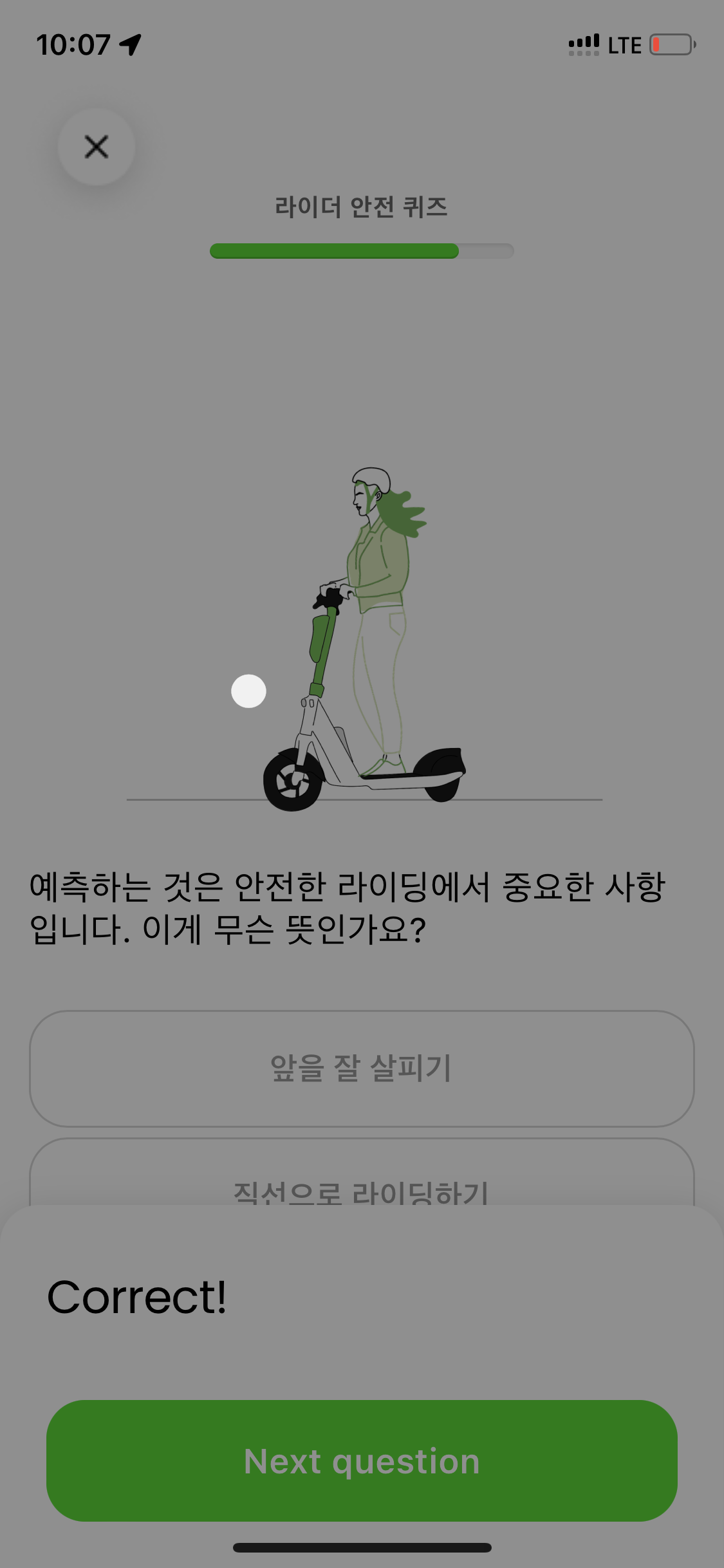 앞에도 캡쳐못한 여러 퀴즈가 있었는데 하여간 퀴즈도 다 풀고 안전교육도 이수한 뒤 딱 한 대 있는 라임 킥보드를 발견해 시동 걸었음.