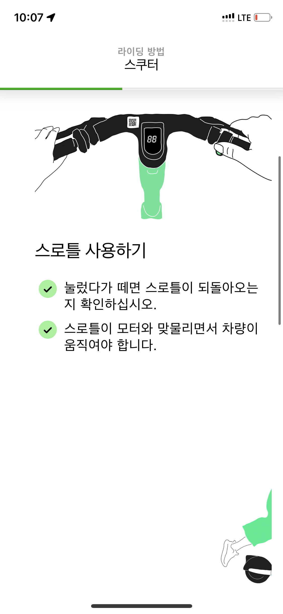한 10분 타다가 답답한 마음에 그냥 내려서 걸으려고 폰을 여니 데모주행이 성공적으로 끝났다며 제한을 풀어준다고 하고 이후부터는 정상 속도인 약 시속 25km 정도로 쾌적한 주행이 가능했다.