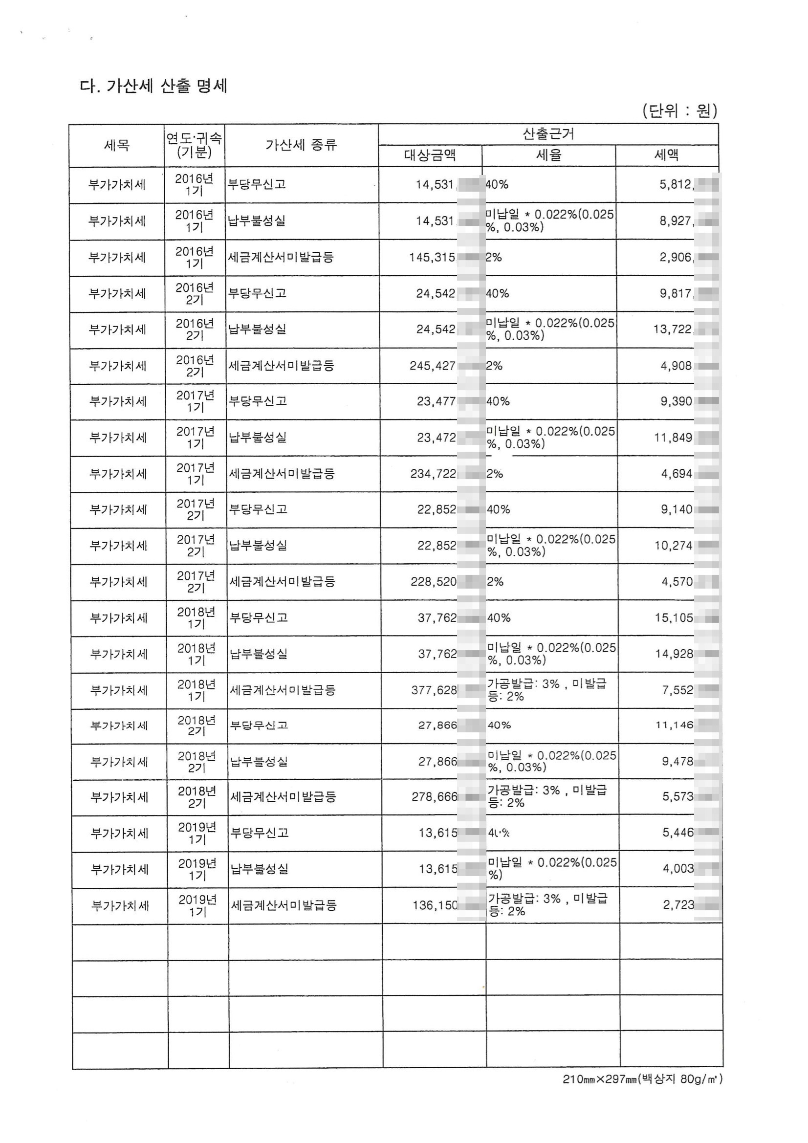 매출 누락 및 사업자미등록가산세, 세금계산서미발급가산세, 부당무신고가산세, 납부불성실가산세 등