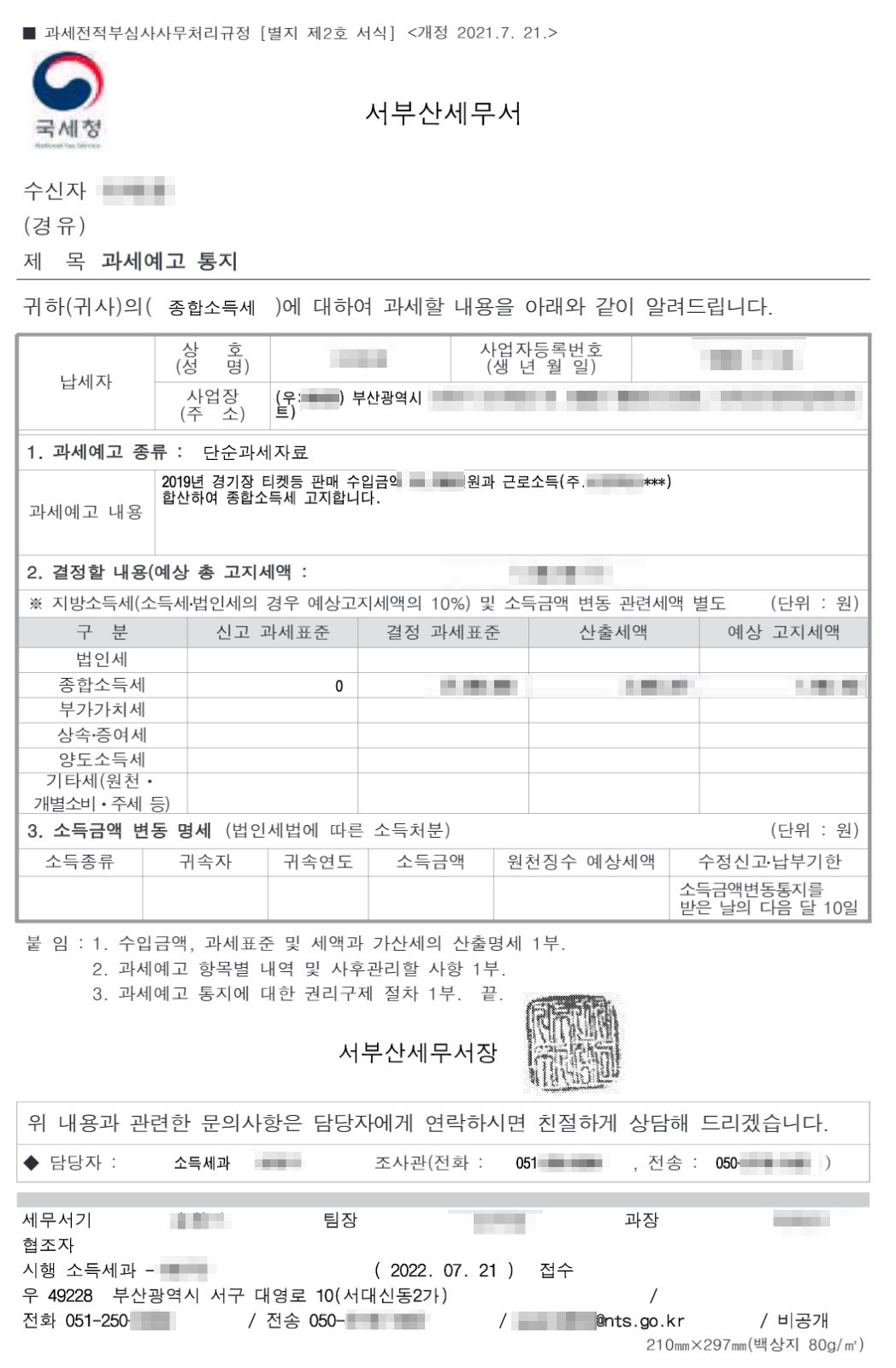 2019년 분에 대한 과세라 시간이 많이 흐르기는 했으나, 티켓베이 종합소득세 및 부가가치세 과세자료 해명과 과세예고통지는 여러번 성공적으로 대응한 적 있어 순조롭게 진행함.