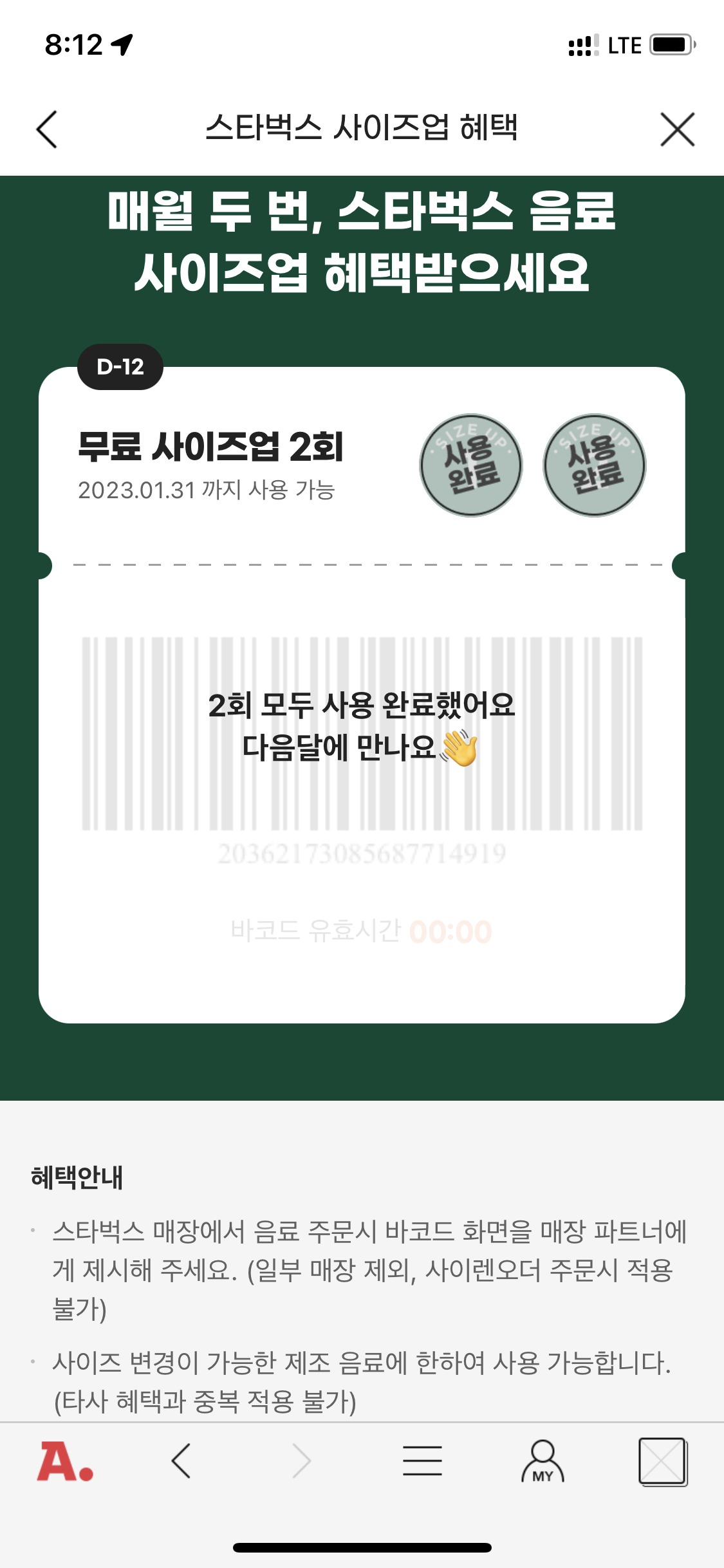 스마일클럽에 스타벅스 사이즈업 혜택이 들어온지 한참 되었는데 사이즈업 적용방식이 점바점.