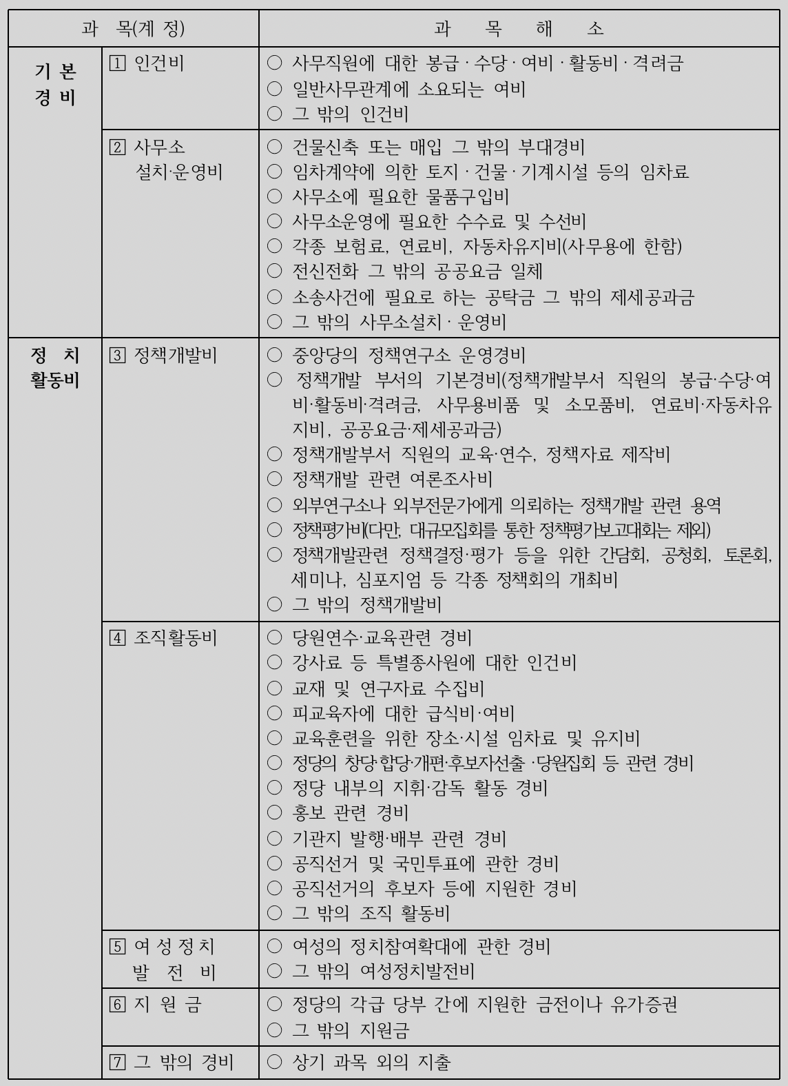 지출계정은 먼저 『보조금외 정치자금』과『보조금』(경상·선거·여성추천·장애인추천)으로 나누고, 그 아래 선거비용과 선거비용외 정치자금으로 구분한 후 선거비용외 정치자금은 인건비, 사무소설치·운영비, 정책개발비, 조직활동비, 여성정치발전비, 지원금, 그 밖의 경비로 과목을 구분함